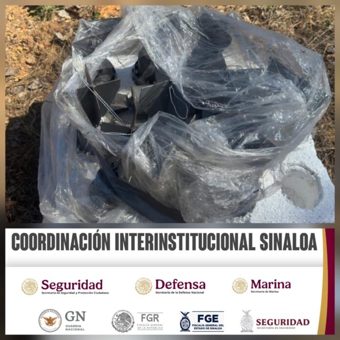 Personal de la Secretaría de Marina y de la Fiscalía General de la República, en coordinación con el Ejército Mexicano, la Guardia Nacional, la Secretaría de Seguridad y Protección Ciudadana, la Fiscalía General del Estado y la Secretaría de Seguridad Pública de Sinaloa, a través de la Policía Estatal Preventiva, aseguró artefactos explosivos en el municipio de Concordia.