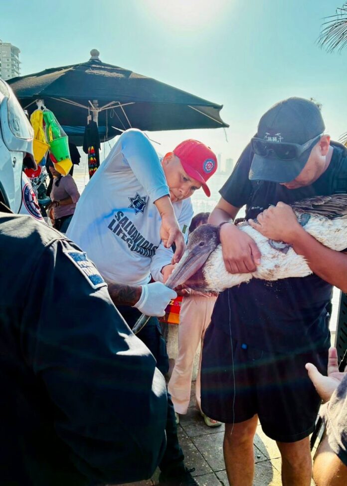 Elementos del Escuadrón de Salvamento Acuático, auxiliaron al ciudadano y al pelícano que resultaron afectados por un anzuelo de pesca.