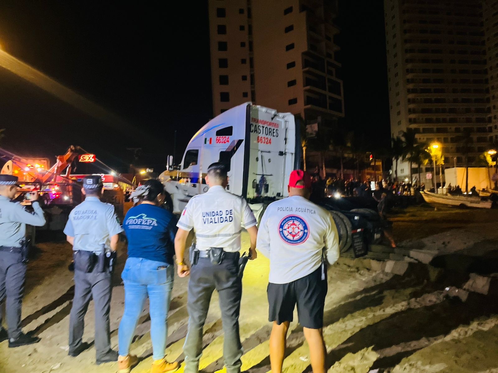 Debido a que el tractocamión quedó atorado en la zona de arena, elementos de la Unidad de Vialidad tomaron conocimiento de los hechos y, en coordinación con personal de grúa, llevaron a cabo las maniobras necesarias para retirar la pesada unidad del área.