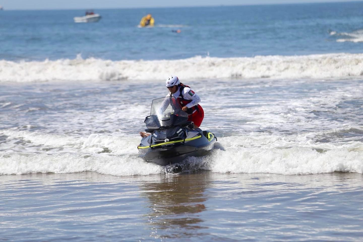 En la segunda intervención, elementos asignados a Playa Camarón activaron el protocolo de rescate para poner a salvo a un grupo de tres personas, dos mujeres y un hombre, que eran jaladas por el oleaje. La primera acción fue mantenerlas a flote y, posteriormente, con apoyo de una moto acuática (jetski), fueron trasladadas a la orilla, donde se les brindó valoración médica básica.
