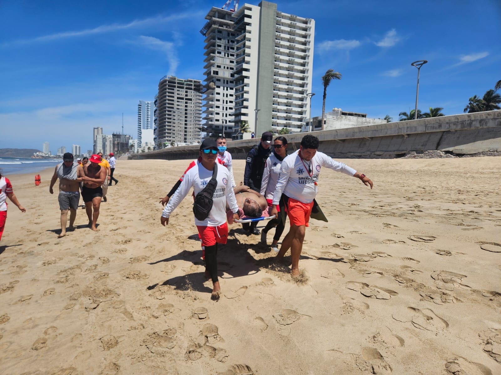En una rápida intervención, elementos del Escuadrón de Salvamento Acuático, adscritos a la Secretaría de Seguridad Pública Municipal, lograron rescatar a dos personas que presentaron dificultades para salir del mar en la zona de Playa Norte.
