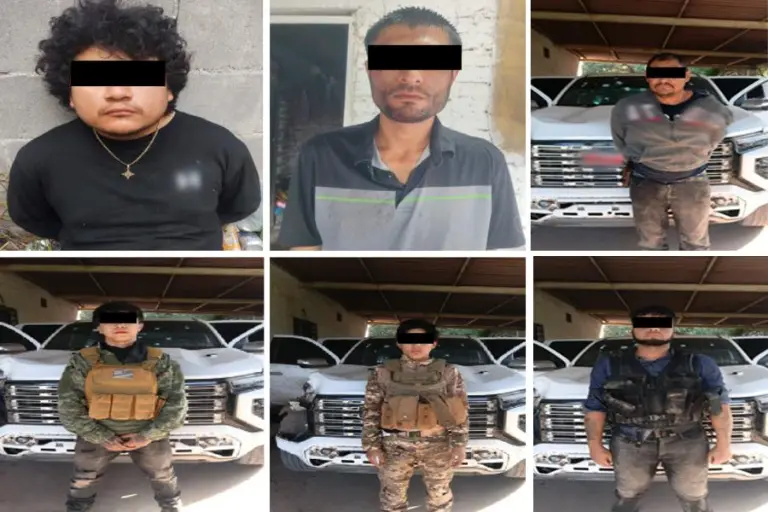 En las fotografías se observa a los detenidos portando chalecos tácticos con portacargadores, sin que se revelaran sus identidades. También se aprecia una camioneta blanca con daños visibles en cristales y cofre, presuntamente causados por disparos.