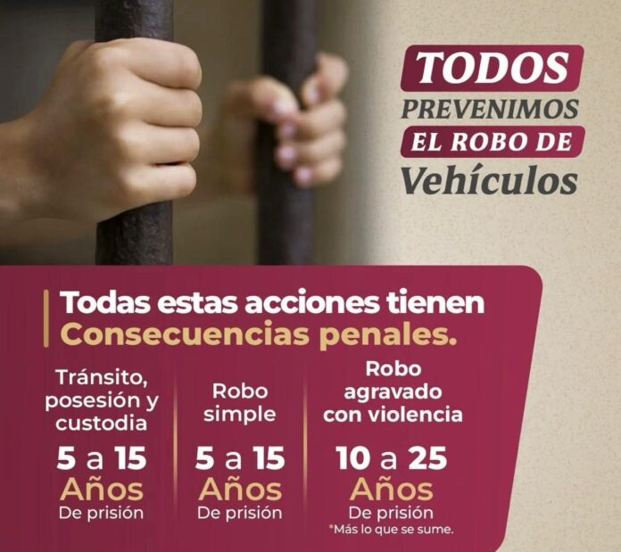 Es importante, dar a conocer a la población que, todas estas acciones tienen consecuencias penales, tales como, de 5 a 15 años de prisión por el tránsito, posesión o custodia de un vehículo robado, así como por robo simple podrían ser sancionado de 5 a 10 años de cárcel y por el robo agravado con violencia, se puede penar con 10 a 25 años de prisión.