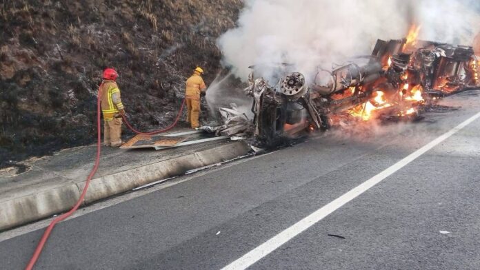 En respuesta a este hecho, agentes pertenecientes al Heroíco Cuerpo de Bomberos Estatal acudieron al lugar, donde se observó un tráiler que transportaba cal, volcado sobre su costado y en total y libre combustión, a la brevedad, se coordinaron acciones para cerrar la carretera, protegiendo de esta manera la integridad de las y los usuarios.