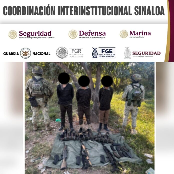 Tres civiles detenidos y armamento asegurado tras operativo del Grupo Interinstitucional en Escuinapa