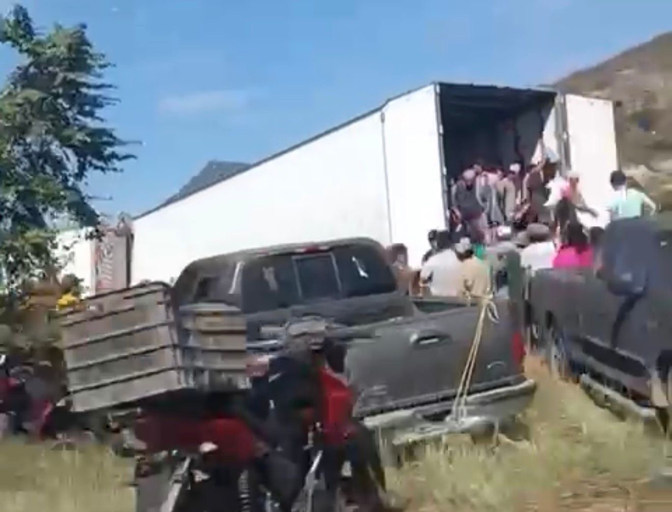Apenas habían pasado algunos minutos, todavía no se recuperaba del susto el chofer de la pesada unidad, cuando empezaron a llegar decenas de personas para intentar llevarse parte de la carga.