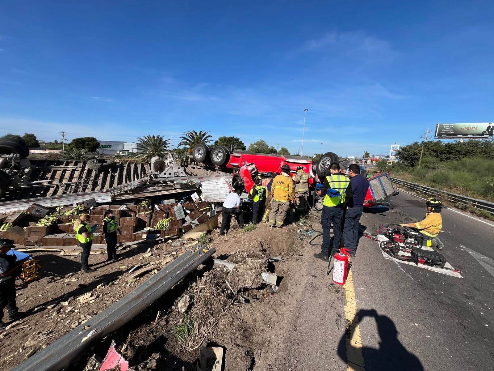 Se informa a la ciudadanía que el carril de sur a norte en el km 0+200, en el trébol de Los Mochis se encuentra completamente cerrado debido a la obstrucción de la vía por un accidente vial, tras la volcadura de un tráiler de doble remolque.