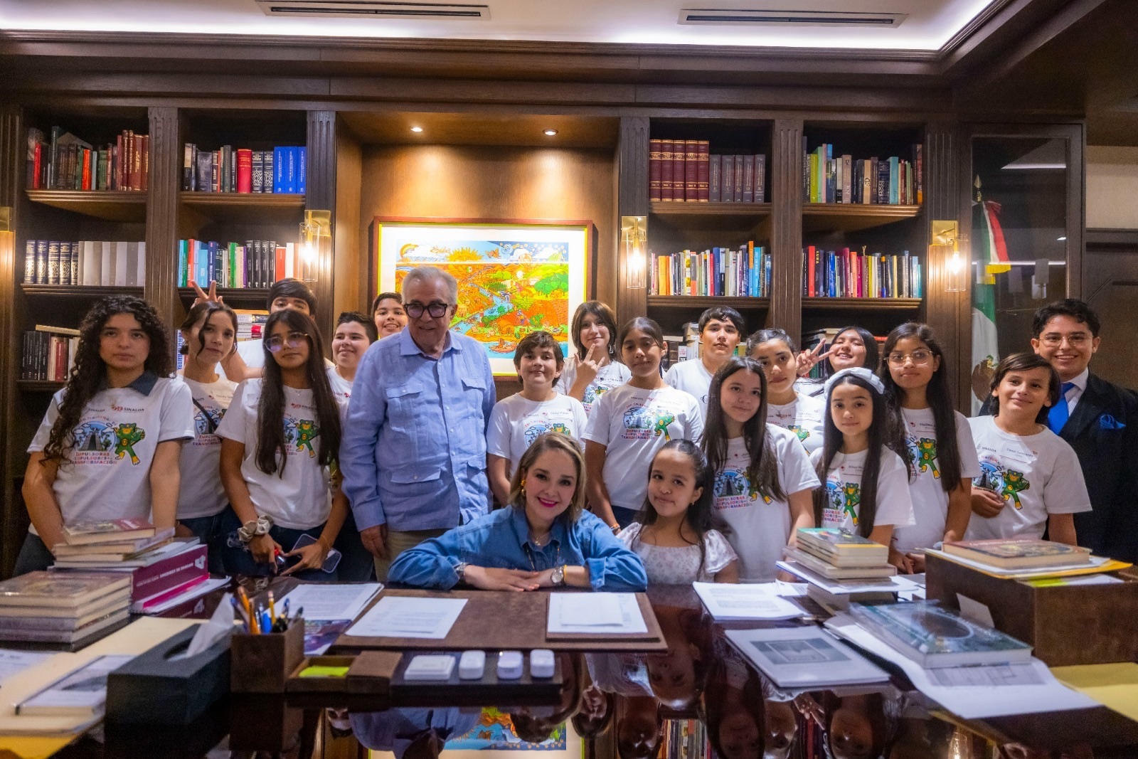 “Quiero felicitarlas y felicitarlos, lo han hecho muy bien con sus lecturas, y los invito a que sigan leyendo y a que escriban su propio libro, que sea de su creación”, les dijo el gobernador, y posteriormente los llevó al Despacho para que conocieran el acervo con el que cuenta, incluyendo los libros que él mismo ha escrito.