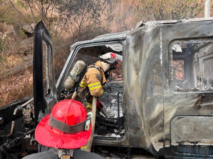 El fuego afectó únicamente la cabina del tráiler remolcador, mientras que el segundo tráiler resultó ileso.
