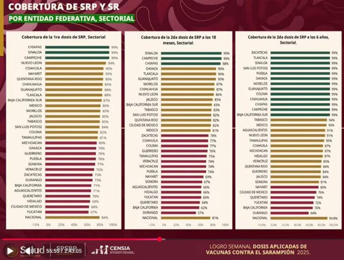 Durante la conferencia matutina de la Presidenta de México, Claudia Sheinbaum, el Secretario de Salud Federal, David Kershenobich, dio a conocer los resultados nacionales en materia de cobertura de vacunación contra el sarampión, destacando que Sinaloa se encuentra entre los primeros tres lugares a nivel nacional en la aplicación de la primera y segunda dosis.
